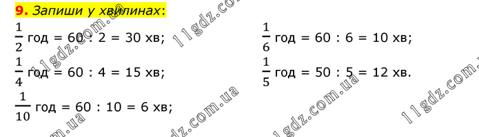 Запиши у хвилинах: 1/2 год = 60 : 2 = 30 хв; 1/4 год = 60 : 4 = 15 хв; 1/10 год = 60 : 10 = 6 хв; 1/6 год = 60 : 6 = 10 хв; 1/5 год = 50 : 5 = 12 хв.