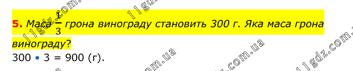 Маса 1/3 грона винограду становить 300 г. Яка маса грона винограду? 300 • 3 = 900 (г).