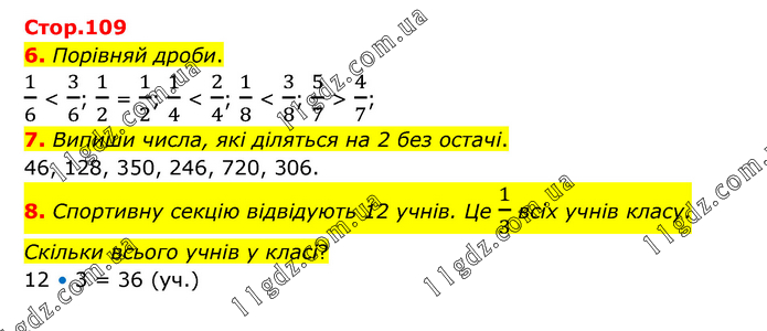 6. Порівняй дроби. 1/6 < 3/6; 1/2 = 1/2; 1/4 < 2/4; 1/8 < 3/8; 5/7 > 4/7; 7. Випиши числа, які діляться на 2 без остачі. 46, 128, 350, 246, 720, 306. 8. Спортивну секцію відвідують 12 учнів. Це 1/3 всіх учнів класу. Скільки всього учнів у класі? 12 • 3 = 36 (уч.)
