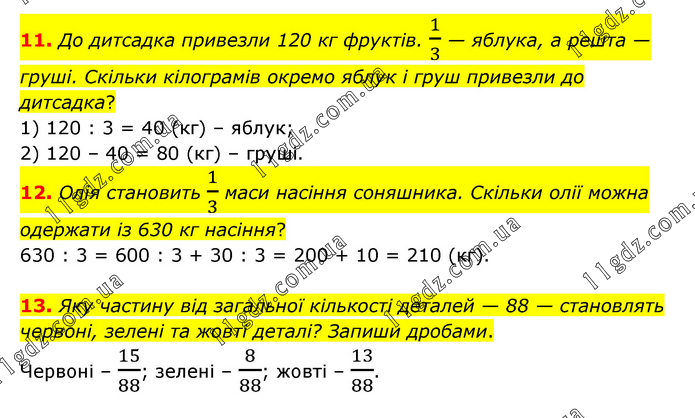 11. До дитсадка привезли 120 кг фруктів. 1/3 — яблука, а решта — груші. Скільки кілограмів окремо яблук і груш привезли до дитсадка? 1) 120 : 3 = 40 (кг) – яблук; 2) 120 – 40 = 80 (кг) – груші. 12. Олія становить 1/3 маси насіння соняшника. Скільки олії можна одержати із 630 кг насіння? 630 : 3 = 600 : 3 + 30 : 3 = 200 + 10 = 210 (кг). Яку частину від загальної кількості деталей — 88 — становлять червоні, зелені та жовті деталі? Запиши дробами. Червоні – 15/88; зелені – 8/88; жовті – 13/88.