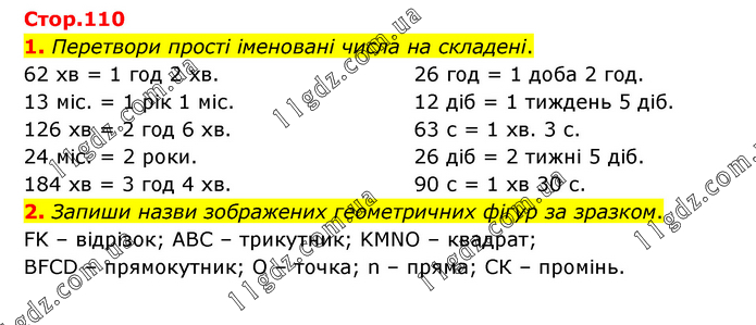 1. Перетвори прості іменовані числа на складені. 62 хв = 1 год 2 хв. 13 міс. = 1 рік 1 міс. 126 хв = 2 год 6 хв. 24 міс. = 2 роки. 184 хв = 3 год 4 хв. 26 год = 1 доба 2 год. 12 діб = 1 тиждень 5 діб. 63 с = 1 хв. 3 с. 26 діб = 2 тижні 5 діб. 90 с = 1 хв 30 с. 2. Запиши назви зображених геометричних фігур за зразком. FK – відрізок; АВС – трикутник; KMNO – квадрат; BFCD – прямокутник; О – точка; n – пряма; СК – промінь.