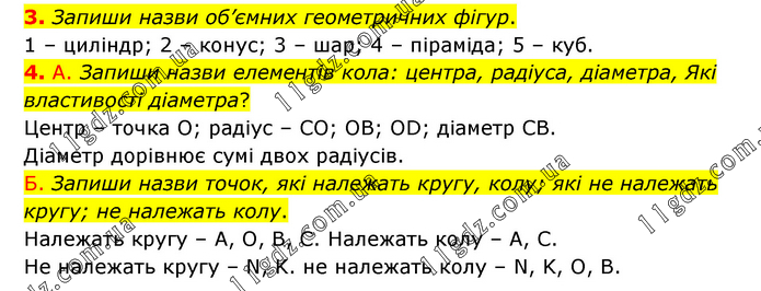3. Запиши назви об’ємних геометричних фігур. 1 – циліндр; 2 – конус; 3 – шар; 4 – піраміда; 5 – куб. 4. А. Запиши назви елементів кола: центра, радіуса, діаметра, Які властивості діаметра? Центр – точка О; радіус – СО; ОВ; ОD; діаметр СВ. Діаметр дорівнює сумі двох радіусів. Б. Запиши назви точок, які належать кругу, колу; які не належать кругу; не належать колу. Належать кругу – А, О, В, С. Належать колу – А, С. Не належать кругу – N, K. не належать колу – N, K, О, В.