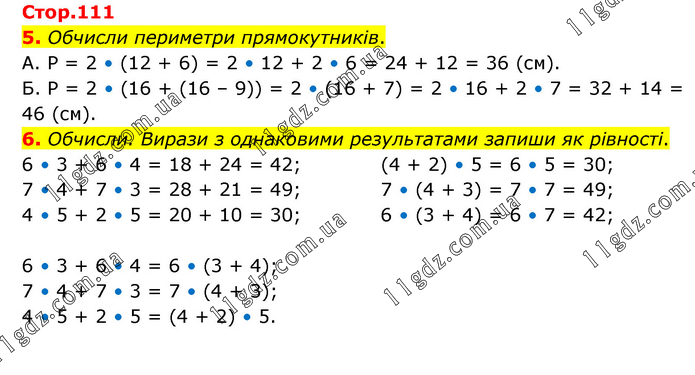 5. Обчисли периметри прямокутників. А. Р = 2 • (12 + 6) = 2 • 12 + 2 • 6 = 24 + 12 = 36 (см). Б. Р = 2 • (16 + (16 – 9)) = 2 • (16 + 7) = 2 • 16 + 2 • 7 = 32 + 14 = 46 (см). 6. Обчисли. Вирази з однаковими результатами запиши як рівності. 6 • 3 + 6 • 4 = 18 + 24 = 42; 7 • 4 + 7 • 3 = 28 + 21 = 49; 4 • 5 + 2 • 5 = 20 + 10 = 30; (4 + 2) • 5 = 6 • 5 = 30; 7 • (4 + 3) = 7 • 7 = 49; 6 • (3 + 4) = 6 • 7 = 42; 6 • 3 + 6 • 4 = 6 • (3 + 4); 7 • 4 + 7 • 3 = 7 • (4 + 3); 4 • 5 + 2 • 5 = (4 + 2) • 5.
