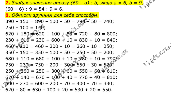7. Знайди значення виразу (60 – а) : b, якщо а = 6, b = 9. (60 – 6) : 9 = 54 : 9 = 6. 8. Обчисли зручним для себе способом. 890 – 150 = 890 – 100 – 50 = 790 – 50 = 740; 250 – 100 = 150; 620 + 180 = 620 + 100 + 80 = 720 + 80 = 800; 230 + 610 = 230 + 600 + 10 = 830 + 10 = 840; 460 – 210 = 460 – 200 – 10 = 260 – 10 = 250; 350 – 150 = 350 – 100 – 50 = 250 – 50 = 200; 680 + 110 = 680 + 100 + 10 = 780 + 10 = 790; 750 – 230 = 750 – 200 – 30 = 550 – 30 = 520; 250 + 360 = 250 + 300 + 60 = 550 + 60 = 610; 670 + 140 = 670 + 100 + 40 = 770 + 40 = 810; 600 – 270 = 600 – 200 – 70 = 400 – 70 = 330; 620 – 80 = 630 – 100 + 20 = 530 + 20 = 550.