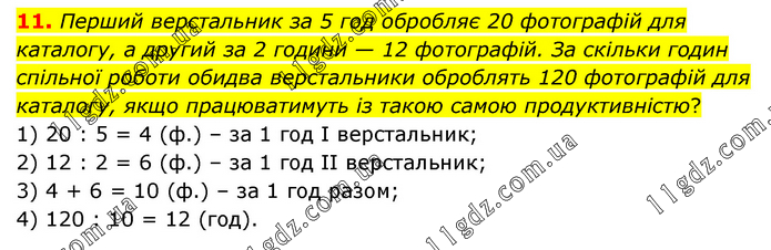 Перший верстальник за 5 год обробляє 20 фотографій для каталогу, а другий за 2 години — 12 фотографій. За скільки годин спільної роботи обидва верстальники оброблять 120 фотографій для каталогу, якщо працюватимуть із такою самою продуктивністю? 1) 20 : 5 = 4 (ф.) – за 1 год І верстальник; 2) 12 : 2 = 6 (ф.) – за 1 год ІІ верстальник; 3) 4 + 6 = 10 (ф.) – за 1 год разом; 4) 120 : 10 = 12 (год).