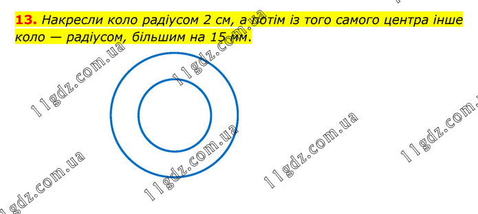 Накресли коло радіусом 2 см, а потім із того самого центра інше коло — радіусом, більшим на 15 мм.