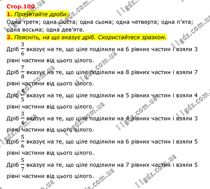 1. Прочитайте дроби. Одна третя; одна шоста; одна сьома; одна четверта; одна п’ята; одна восьма; одна дев’ята. 2. Поясніть, на що вказує дріб. Скористайтеся зразком. Дріб 3/6 вказує на те, що ціле поділили на 6 рівних частин і взяли 3 рівні частини від цього цілого. Дріб 7/8 вказує на те, що ціле поділили на 8 рівних частин і взяли 7 рівні частини від цього цілого. Дріб 4/5 вказує на те, що ціле поділили на 5 рівних частин і взяли 4 рівні частини від цього цілого. Дріб 3/4 вказує на те, що ціле поділили на 4 рівних частин і взяли 3 рівні частини від цього цілого. Дріб 5/6 вказує на те, що ціле поділили на 6 рівних частин і взяли 5 рівні частини від цього цілого. Дріб 5/7 вказує на те, що ціле поділили на 7 рівних частин і взяли 5 рівні частини від цього цілого.
