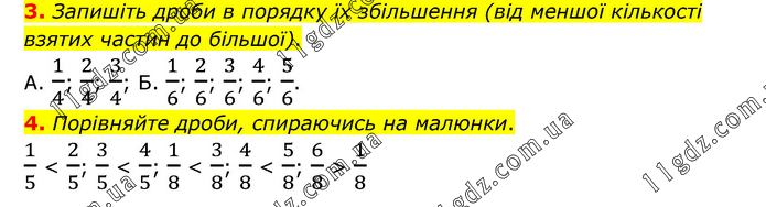 3. Запишіть дроби в порядку їх збільшення (від меншої кількості взятих частин до більшої). А. 1/4; 2/4; 3/4; Б. 1/6; 2/6; 3/6; 4/6; 5/6. 4. Порівняйте дроби, спираючись на малюнки. 1/5 < 2/5; 3/5 < 4/5; 1/8 < 3/8; 4/8 < 5/8; 6/8 > 1/8
