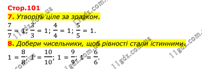 7. Утворіть ціле за зразком. 7/7 = 1; 3/3 = 1; 4/4 = 1; 5/5 = 1. 8. Добери чисельники, щоб рівності стали істинними. 1 = 8/8; 1 = 10/10; 1 = 9/9; 1 = 6/6.