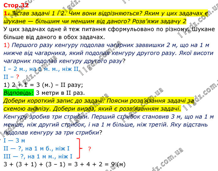 1. Зістав задачі 1 і 2. Чим вони відрізняються? Яким у цих задачах є шукане — більшим чи меншим від даного? Розв’яжи задачу 2 У цих задачах одне й теж питання сформульовано по різному. Шукане більше від даного в обох задачах. 1) Першого разу кенгуру подолав чагарник заввишки 2 м, що на 1 м нижче від чагарника, який подолав кенгуру другого разу. Якої висоти чагарник подолав кенгуру другого разу? І – 2 м., на 1 м. м., ніж ІІ ІІ – ? 1) 2 + 1 = 3 (м.) – ІІ разу; Відповідь: 3 метри в ІІ раз. Добери короткий запис до задачі. Поясни розв’язання задачі за схемою аналізу. Добери вираз, який є розв’язанням задачі. Кенгуру зробив три стрибки. Перший стрибок становив 3 м, що на 1 м менше, ніж другий стрибок, і на 1 м більше, ніж третій. Яку відстань подолав кенгуру за три стрибки? І — 3 м ІІ — ?, на 1 м б., ніж І ІІІ — ?, на 1 м м., ніж І 3 + (3 + 1) + (3 – 1) = 3 + 4 + 2 = 9 (м)