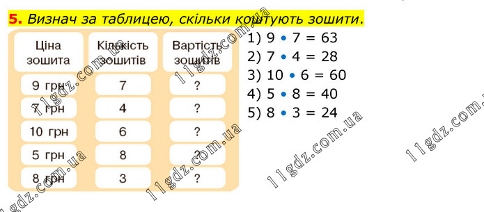 Визнач за таблицею, скільки коштують зошити. 1) 9 • 7 = 63 2) 7 • 4 = 28 3) 10 • 6 = 60 4) 5 • 8 = 40 5) 8 • 3 = 24