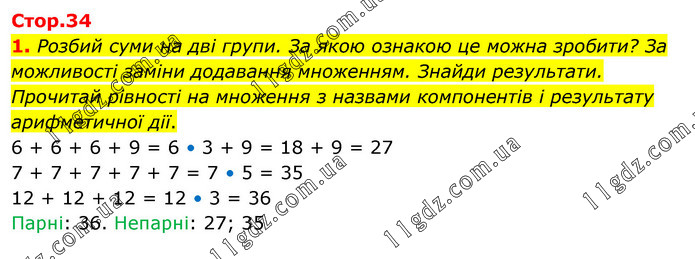 1. Розбий суми на дві групи. За якою ознакою це можна зробити? За можливості заміни додавання множенням. Знайди результати. Прочитай рівності на множення з назвами компонентів і результату арифметичної дії. 6 + 6 + 6 + 9 = 6 • 3 + 9 = 18 + 9 = 27 7 + 7 + 7 + 7 + 7 = 7 • 5 = 35 12 + 12 + 12 = 12 • 3 = 36 Парні: 36. Непарні: 27; 35
