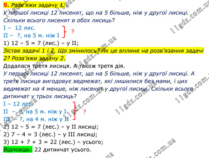 9. Розв’яжи задачу 1. У першої лисиці 12 лисенят, що на 5 більше, ніж у другої лисиці. Скільки всього лисенят в обох лисиць? І – 12 лис. ІІ – ?, на 5 м. ніж І 1) 12 – 5 = 7 (лис.) – у ІІ; Зістав задачі 1 і 2. Що змінилось? Як це вплине на розв’язання задачі 2? Розв’яжи задачу 2. Додалася третя лисиця. А також третя дія. У першої лисиці 12 лисенят, що на 5 більше, ніж у другої лисиці. А третя лисиця вигодовує ведмежат, які лишилися без мами, і цих ведмежат на 4 менше, ніж лисенят у другої лисиці. Скільки всього дитинчат у трьох лисиць? І – 12 лес. ІІ – ?, на 5 м. ніж у І ІІІ – ?, на 4 м. ніж у ІІ 1) 12 – 5 = 7 (лес.) – у ІІ лисиці; 2) 7 – 4 = 3 (лес.) – у ІІІ лисиці; 3) 12 + 7 + 3 = 22 (лес.) – усього; Відповідь: 22 дитинчат усього.
