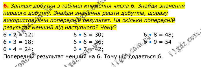 Запиши добутки з таблиці множення числа 6. Знайди значення першого добутку. Знайди значення решти добутків, щоразу використовуючи попередній результат. На скільки попередній результат менший від наступного? Чому? 6 • 2 = 12; 6 • 3 = 18; 6 • 4 = 24; 6 • 5 = 30; 6 • 6 = 36; 6 • 7 = 42; 6 • 8 = 48; 6 • 9 = 54 Попередній результат менший на 6. Тому що додається 6.