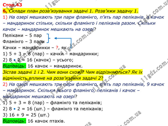 Склади план розв’язування задачі 1. Розв’яжи задачу 1. 1) На озері мешкають три пари фламінго, п’ять пар пеліканів, а качок – мандаринок стільки, скільки фламінго і пеліканів разом. Скільки качок – мандаринок мешкають на озері? Пелікани – 5 пар Фламінго – 3 пари Качки – мандаринки – ?, як 1) 5 + 3 = 8 (пар) – качки – мандаринки; 2) 8 • 2 = 16 (качок) – усього; Відповідь: 16 качок – мандаринок. Зістав задачі 1 і 2. Чим вони схожі? Чим відрізняються? Як їх відмінність вплине на розв’язання задачі 2? 2) На озері мешкають три пари фламінго, п’ять пар пеліканів, 9 качок – мандаринок. Скільки всього фламінго, пеліканів і качок – мандаринок мешкають на озері? 1) 5 + 3 = 8 (пар) – фламінго та пеліканів; 2) 8 • 2 = 16 (шт.) – фламінго та пеліканів; 3) 16 + 9 = 25 (шт.) Відповідь: 16 качок птахів.