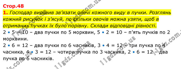 Господар вирішив зв’язати овочі кожного виду в пучки. Розглянь кожний рисунок і з’ясуй, по скільки овочів можна узяти, щоб в отриманих пучках їх було порівну. Склади відповідні рівності. 2 • 5 = 10 – два пучки по 5 морквин, 5 • 2 = 10 – п’ять пучків по 2 морквини. 2 • 6 = 12 – два пучки по 6 часників, 3 • 4 = 12 – три пучка по 4 часника, 4 • 3 = 12 – чотири пучка по 3 часника, 2 • 6 = 12 – два пучка по 6 часників.