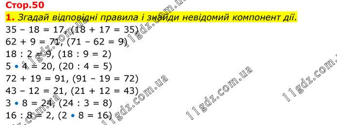 Згадай відповідні правила і знайди невідомий компонент дії. 35 – 18 = 17, (18 + 17 = 35) 62 + 9 = 71, (71 – 62 = 9) 18 : 2 = 9, (18 : 9 = 2) 5 • 4 = 20, (20 : 4 = 5) 72 + 19 = 91, (91 – 19 = 72) 43 – 12 = 21, (21 + 12 = 43) 3 • 8 = 24, (24 : 3 = 8) 16 : 8 = 2, (2 • 8 = 16)