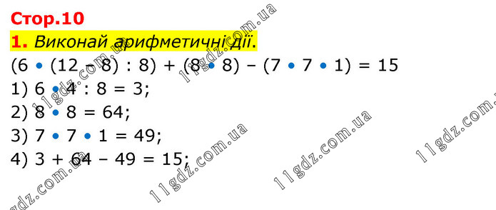 Виконай арифметичні дії. (6 • (12 – 8) : 8) + (8 • 8) – (7 • 7 • 1) = 15 1) 6 • 4 : 8 = 3; 2) 8 • 8 = 64; 3) 7 • 7 • 1 = 49; 4) 3 + 64 – 49 = 15;
