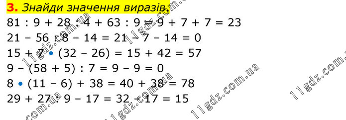 Знайди значення виразів. 81 : 9 + 28 : 4 + 63 : 9 = 9 + 7 + 7 = 23 21 – 56 : 8 – 14 = 21 – 7 – 14 = 0 15 + 7 • (32 – 26) = 15 + 42 = 57 9 – (58 + 5) : 7 = 9 – 9 = 0 8 • (11 – 6) + 38 = 40 + 38 = 78 29 + 27 : 9 – 17 = 32 – 17 = 15