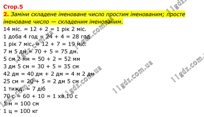Заміни складене іменоване число простим іменованим; просте іменоване число — складеним іменованим. 14 міс. = 12 + 2 = 1 рік 2 міс. 1 доба 4 год = 24 + 4 = 28 год 1 рік 7 міс. = 12 + 7 = 19 міс. 7 м 5 дм = 70 + 5 = 75 дм. 5 см 2 мм = 50 + 2 = 52 мм 3 дм 5 см = 30 + 5 = 35 см 42 дм = 40 дм + 2 дм = 4 м 2 дм 25 см = 20 + 5 = 2 дм 5 см 1 тижд. = 7 діб 70 с = 60 + 10 = 1 хв 10 с 1 м = 100 см 1 ц = 100 кг