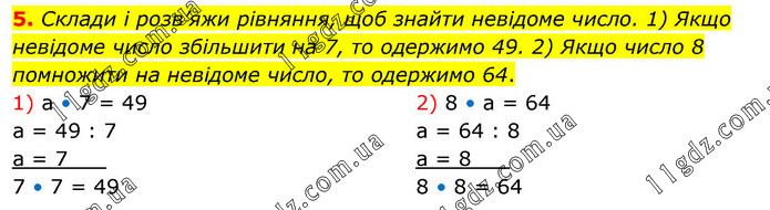 Склади і розв’яжи рівняння, щоб знайти невідоме число. 1) Якщо невідоме число збільшити на 7, то одержимо 49. 2) Якщо число 8 помножити на невідоме число, то одержимо 64. 1) а • 7 = 49 а = 49 : 7 а = 7___ 7 • 7 = 49 2) 8 • а = 64 а = 64 : 8 а = 8___ 8 • 8 = 64