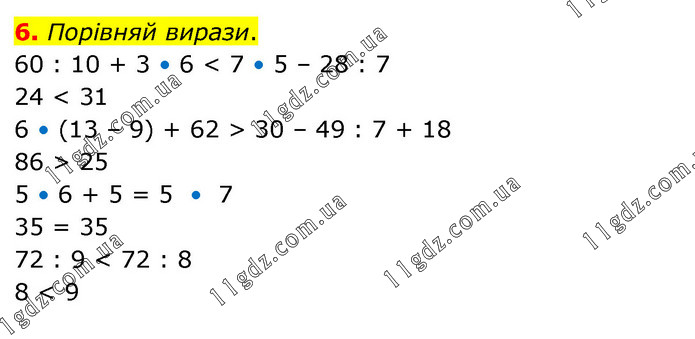 Порівняй вирази. 60 : 10 + 3 • 6 < 7 • 5 – 28 : 7 24 < 31 6 • (13 – 9) + 62 > 30 – 49 : 7 + 18 86 > 25 5 • 6 + 5 = 5 • 7 35 = 35 72 : 9 < 72 : 8 8 < 9