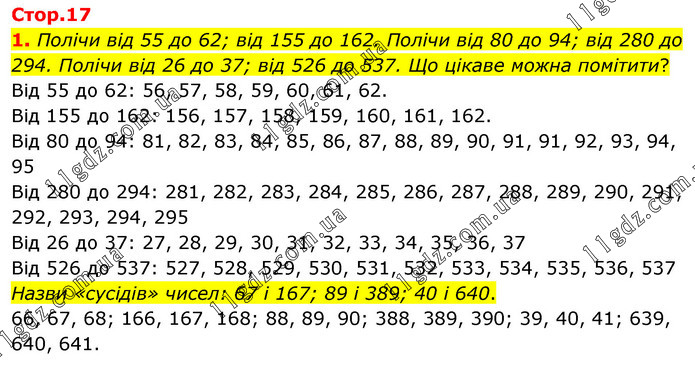 1. Полічи від 55 до 62; від 155 до 162. Полічи від 80 до 94; від 280 до 294. Полічи від 26 до 37; від 526 до 537. Що цікаве можна помітити? Від 55 до 62: 56, 57, 58, 59, 60, 61, 62. Від 155 до 162: 156, 157, 158, 159, 160, 161, 162. Від 80 до 94: 81, 82, 83, 84, 85, 86, 87, 88, 89, 90, 91, 91, 92, 93, 94, 95 Від 280 до 294: 281, 282, 283, 284, 285, 286, 287, 288, 289, 290, 291, 292, 293, 294, 295 Від 26 до 37: 27, 28, 29, 30, 31, 32, 33, 34, 35, 36, 37 Від 526 до 537: 527, 528, 529, 530, 531, 532, 533, 534, 535, 536, 537 Назви «сусідів» чисел: 67 і 167; 89 і 389; 40 і 640. 66, 67, 68; 166, 167, 168; 88, 89, 90; 388, 389, 390; 39, 40, 41; 639, 640, 641.