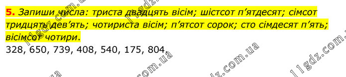Запиши числа: триста двадцять вісім; шістсот п’ятдесят; сімсот тридцять дев’ять; чотириста вісім; п’ятсот сорок; сто сімдесят п’ять; вісімсот чотири. 328, 650, 739, 408, 540, 175, 804.