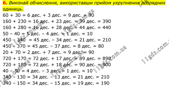 Виконай обчислення, використавши прийом укрупнення розрядних одиниць. 60 + 30 = 6 дес. + 3 дес. = 9 дес. = 90 160 + 230 = 16 дес. + 23 дес. = 39 дес. = 390 160 + 280 = 16 дес. + 28 дес. = 44 дес. = 440 50 – 40 = 5 дес. – 4 дес. = 1 дес. = 10 450 – 340 = 45 дес. – 34 дес. = 21 дес. = 210 450 – 370 = 45 дес. – 37 дес. = 8 дес. = 80 20 + 70 = 2 дес. + 7 дес. = 9 дес. = 90 720 + 170 = 72 дес. + 17 дес. = 89 дес. = 890 720 + 180 = 72 дес. + 18 дес. = 90 дес. = 900 40 – 30 = 4 дес. – 3 дес. = 1 дес. = 10 340 – 130 = 34 дес. – 13 дес. = 21 дес. = 210 340 – 150 = 34 дес. – 15 дес. = 19 дес. = 190