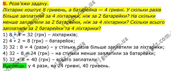 Розв’яжи задачу. Ліхтарик коштує 8 гривень, а батарейка — 4 гривні. У скільки разів більше заплати¬ли за 4 ліхтарики, ніж за 2 батарейки? На скільки менше заплатили за 2 бата¬рейки, ніж за 4 ліхтарики? Скільки всього заплатили за 2 батарейки та 4 ліхтарики? 1) 8 • 4 = 32 (грн) – ліхтариків; 2) 4 • 2 = 8 (грн) – батарейок; 3) 32 : 8 = 4 (рази) – у стільки разів більше заплати¬ли за ліхтарики; 4) 32 – 8 = 24 (грн) – на стільки менше заплатили за бата¬рейки; 5) 32 + 8 = 40 (грн) – всього заплатили. Відповідь: у 4 рази, на 24 гривні, 40 гривень.
