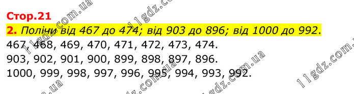 Полічи від 467 до 474; від 903 до 896; від 1000 до 992. 467, 468, 469, 470, 471, 472, 473, 474. 903, 902, 901, 900, 899, 898, 897, 896. 1000, 999, 998, 997, 996, 995, 994, 993, 992.