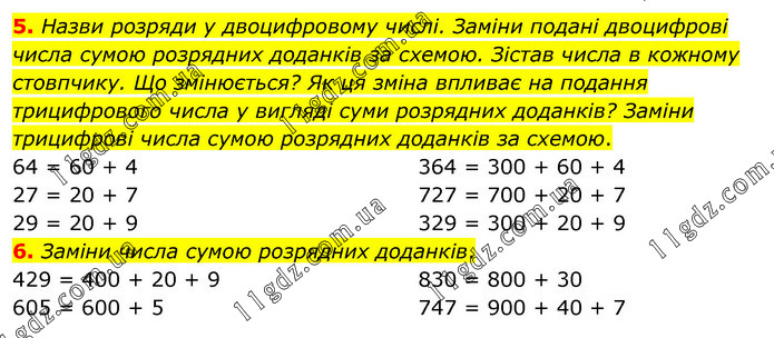 5. Назви розряди у двоцифровому числі. Заміни подані двоцифрові числа сумою розрядних доданків за схемою. Зістав числа в кожному стовпчику. Що змінюється? Як ця зміна впливає на подання трицифрового числа у вигляді суми розрядних доданків? Заміни трицифрові числа сумою розрядних доданків за схемою. 64 = 60 + 4 27 = 20 + 7 29 = 20 + 9 364 = 300 + 60 + 4 727 = 700 + 20 + 7 329 = 300 + 20 + 9 6. Заміни числа сумою розрядних доданків. 429 = 400 + 20 + 9 605 = 600 + 5 830 = 800 + 30 747 = 900 + 40 + 7