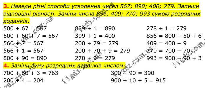 3. Наведи різні способи утворення чисел 567; 890; 400; 279. Запиши відповідні рівності. Заміни числа 856; 409; 770; 993 сумою розрядних доданків. 500 + 67 = 567 500 + 60 + 7 = 567 560 + 7 = 567 566 + 1 = 567 800 + 90 = 890 889 + 1 = 890 399 + 1 = 400 200 + 79 = 279 200 + 70 + 9 = 279 270 + 9 = 279 278 + 1 = 279 856 = 800 + 50 + 6 409 = 400 + 9 770 = 700 + 70 993 = 900 + 90 + 3 4. Заміни суму розрядних доданків числом. 700 + 60 + 3 = 763 200 + 4 = 204 300 + 90 = 390 900 + 10 + 5 = 915