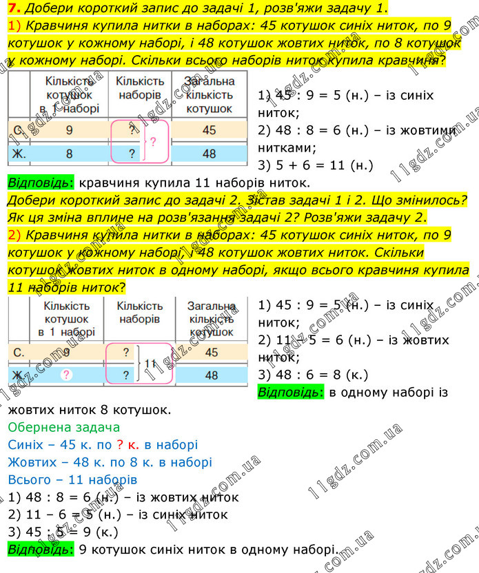 Добери короткий запис до задачі 1, розв'яжи задачу 1. 1) Кравчиня купила нитки в наборах: 45 котушок синіх ниток, по 9 котушок у кожному наборі, і 48 котушок жовтих ниток, по 8 котушок у кожному наборі. Скільки всього наборів ниток купила кравчиня? 1) 45 : 9 = 5 (н.) – із синіх ниток; 2) 48 : 8 = 6 (н.) – із жовтими нитками; 3) 5 + 6 = 11 (н.) Відповідь: кравчиня купила 11 наборів ниток. Добери короткий запис до задачі 2. Зістав задачі 1 і 2. Що змінилось? Як ця зміна вплине на розв'язання задачі 2? Розв'яжи задачу 2. 2) Кравчиня купила нитки в наборах: 45 котушок синіх ниток, по 9 котушок у кожному наборі, і 48 котушок жовтих ниток. Скільки котушок жовтих ниток в одному наборі, якщо всього кравчиня купила 11 наборів ниток? 1) 45 : 9 = 5 (н.) – із синіх ниток; 2) 11 – 5 = 6 (н.) – із жовтих ниток; 3) 48 : 6 = 8 (к.) Відповідь: в одному наборі із жовтих ниток 8 котушок. Обернена задача Синіх – 45 к. по ? к. в наборі Жовтих – 48 к. по 8 к. в наборі Всього – 11 наборів 1) 48 : 8 = 6 (н.) – із жовтих ниток 2) 11 – 6 = 5 (н.) – із синіх ниток 3) 45 : 5 = 9 (к.) Відповідь: 9 котушок синіх ниток в одному наборі.