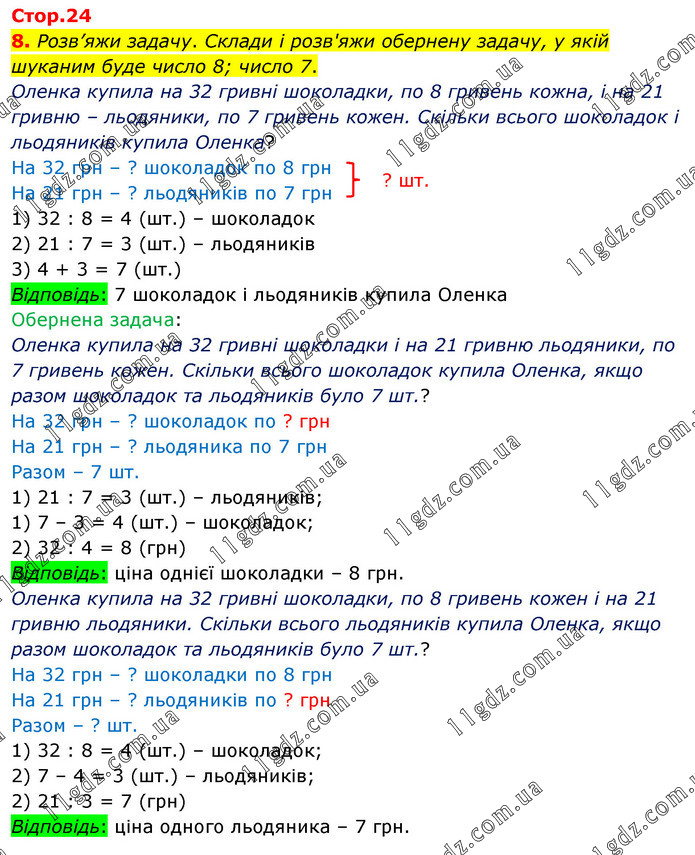 8. Розв’яжи задачу. Склади і розв'яжи обернену задачу, у якій шуканим буде число 8; число 7. Оленка купила на 32 гривні шоколадки, по 8 гривень кожна, і на 21 гривню – льодяники, по 7 гривень кожен. Скільки всього шоколадок і льодяників купила Оленка? На 32 грн – ? шоколадок по 8 грн На 21 грн – ? льодяників по 7 грн 1) 32 : 8 = 4 (шт.) – шоколадок 2) 21 : 7 = 3 (шт.) – льодяників 3) 4 + 3 = 7 (шт.) Відповідь: 7 шоколадок і льодяників купила Оленка Обернена задача: Оленка купила на 32 гривні шоколадки і на 21 гривню льодяники, по 7 гривень кожен. Скільки всього шоколадок купила Оленка, якщо разом шоколадок та льодяників було 7 шт.? На 32 грн – ? шоколадок по ? грн На 21 грн – ? льодяника по 7 грн Разом – 7 шт. 1) 21 : 7 = 3 (шт.) – льодяників; 1) 7 – 3 = 4 (шт.) – шоколадок; 2) 32 : 4 = 8 (грн) Відповідь: ціна однієї шоколадки – 8 грн. Оленка купила на 32 гривні шоколадки, по 8 гривень кожен і на 21 гривню льодяники. Скільки всього льодяників купила Оленка, якщо разом шоколадок та льодяників було 7 шт.? На 32 грн – ? шоколадки по 8 грн На 21 грн – ? льодяників по ? грн Разом – ? шт. 1) 32 : 8 = 4 (шт.) – шоколадок; 2) 7 – 4 = 3 (шт.) – льодяників; 2) 21 : 3 = 7 (грн) Відповідь: ціна одного льодяника – 7 грн.