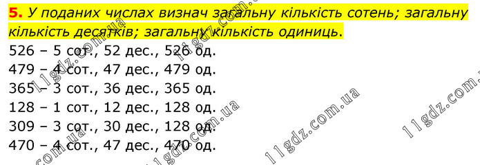 5. У поданих числах визнач загальну кількість сотень; загальну кількість десятків; загальну кількість одиниць. 526 – 5 сот., 52 дес., 526 од. 479 – 4 сот., 47 дес., 479 од. 365 – 3 сот., 36 дес., 365 од. 128 – 1 сот., 12 дес., 128 од. 309 – 3 сот., 30 дес., 128 од. 470 – 4 сот., 47 дес., 470 од.