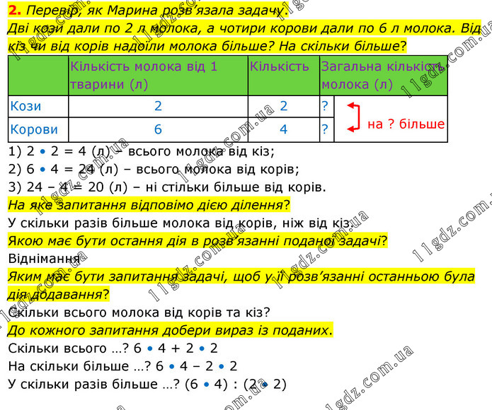 Перевір, як Марина розв’язала задачу. Дві кози дали по 2 л молока, а чотири корови дали по 6 л молока. Від кіз чи від корів надоїли молока більше? На скільки більше? 1) 2 • 2 = 4 (л) – всього молока від кіз; 2) 6 • 4 = 24 (л) – всього молока від корів; 3) 24 – 4 = 20 (л) – ні стільки більше від корів. На яке запитання відповімо дією ділення? У скільки разів більше молока від корів, ніж від кіз. Якою має бути остання дія в розв’язанні поданої задачі? Віднімання Яким має бути запитання задачі, щоб у її розв’язанні останньою була дія додавання? Скільки всього молока від корів та кіз? До кожного запитання добери вираз із поданих. Скільки всього …? 6 • 4 + 2 • 2 На скільки більше …? 6 • 4 – 2 • 2 У скільки разів більше …? (6 • 4) : (2 • 2)