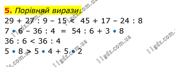 Порівняй вирази. 29 + 27 : 9 – 15 < 45 + 17 – 24 : 8 7 • 6 – 36 : 4 = 54 : 6 + 3 • 8 36 : 6 < 36 : 4 5 • 8 > 5 • 4 + 5 • 2