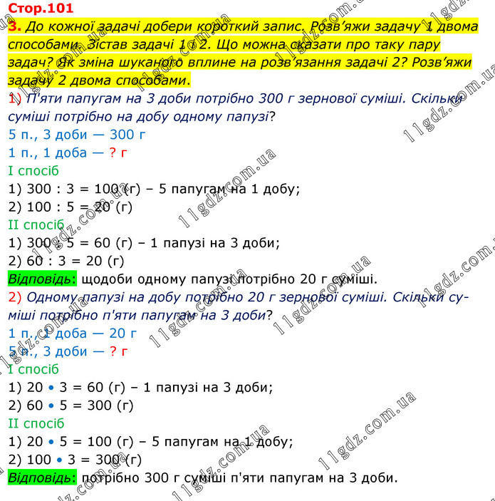 До кожної задачі добери короткий запис. Розв’яжи задачу 1 двома способами. Зістав задачі 1 і 2. Що можна сказати про таку пару задач? Як зміна шуканого вплине на розв’язання задачі 2? Розв’яжи задачу 2 двома способами. 1) П'яти папугам на 3 доби потріб¬но 300 г зернової суміші. Скіль¬ки суміші потрібно на добу од¬ному папузі? 5 п., 3 доби — 300 г 1 п., 1 доба — ? г І спосіб 1) 300 : 3 = 100 (г) – 5 папугам на 1 добу; 2) 100 : 5 = 20 (г) ІІ спосіб 1) 300 : 5 = 60 (г) – 1 папузі на 3 доби; 2) 60 : 3 = 20 (г) Відповідь: щодоби одному папузі потрібно 20 г суміші. 2) Одному папузі на добу потрібно 20 г зернової суміші. Скільки су-міші потрібно п'яти папугам на 3 доби? 1 п., 1 доба — 20 г 5 п., 3 доби — ? г І спосіб 1) 20 • 3 = 60 (г) – 1 папузі на 3 доби; 2) 60 • 5 = 300 (г) ІІ спосіб 1) 20 • 5 = 100 (г) – 5 папугам на 1 добу; 2) 100 • 3 = 300 (г) Відповідь: потрібно 300 г суміші п'яти папугам на 3 доби.