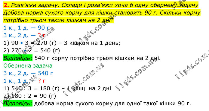 Розв’яжи задачу. Склади і розв’яжи хоча б одну обернену задачу Добова норма сухого корму для кішки становить 90 г. Скільки корму потрібно трьом таким кішкам на 2 дні? 1 к., 1 д. — 90 г 3 к., 2 д. — ? г 1) 90 • 3 = 270 (г) – 3 кішкам на 1 день; 2) 270 • 2 = 540 (г) Відповідь: 540 г корму потрібно трьом кішкам на 2 дні. Обернена задача 3 к., 2 д. — 540 г 1 к., 1 д. — ? г 1) 540 : 3 = 180 (г) – 1 кішці на 2 дні 2) 180 : 2 = 90 (г) Відповідь: добова норма сухого корму для одної такої кішки 90 г.
