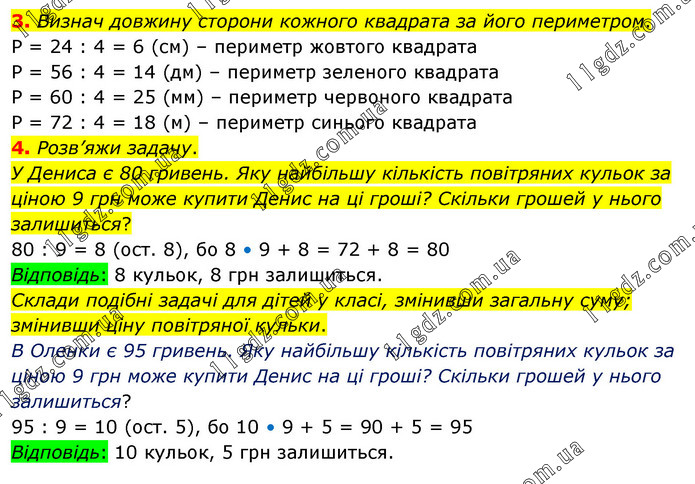 3. Визнач довжину сторони кожного квадрата за його периметром. Р = 24 : 4 = 6 (см) – периметр жовтого квадрата Р = 56 : 4 = 14 (дм) – периметр зеленого квадрата Р = 60 : 4 = 25 (мм) – периметр червоного квадрата Р = 72 : 4 = 18 (м) – периметр синього квадрата 4. Розв’яжи задачу. У Дениса є 80 гривень. Яку найбільшу кількість повітряних кульок за ціною 9 грн може купити Денис на ці гроші? Скільки грошей у нього залишиться? 80 : 9 = 8 (ост. 8), бо 8 • 9 + 8 = 72 + 8 = 80 Відповідь: 8 кульок, 8 грн залишиться. Склади подібні задачі для дітей у класі, змінивши загальну суму; змінивши ціну повітряної кульки. В Оленки є 95 гривень. Яку найбільшу кількість повітряних кульок за ціною 9 грн може купити Денис на ці гроші? Скільки грошей у нього залишиться? 95 : 9 = 10 (ост. 5), бо 10 • 9 + 5 = 90 + 5 = 95 Відповідь: 10 кульок, 5 грн залишиться.
