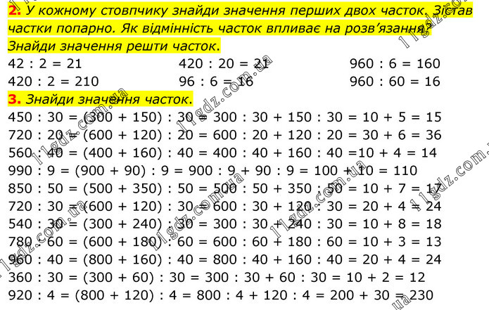 2. У кожному стовпчику знайди значення перших двох часток. Зістав частки попарно. Як відмінність часток впливає на розв’язання? Знайди значення решти часток. 42 : 2 = 21 420 : 2 = 210 420 : 20 = 21 96 : 6 = 16 960 : 6 = 160 960 : 60 = 16 3. Знайди значення часток. 450 : 30 = (300 + 150) : 30 = 300 : 30 + 150 : 30 = 10 + 5 = 15 720 : 20 = (600 + 120) : 20 = 600 : 20 + 120 : 20 = 30 + 6 = 36 560 : 40 = (400 + 160) : 40 = 400 : 40 + 160 : 40 =10 + 4 = 14 990 : 9 = (900 + 90) : 9 = 900 : 9 + 90 : 9 = 100 + 10 = 110 850 : 50 = (500 + 350) : 50 = 500 : 50 + 350 : 50 = 10 + 7 = 17 720 : 30 = (600 + 120) : 30 = 600 : 30 + 120 : 30 = 20 + 4 = 24 540 : 30 = (300 + 240) : 30 = 300 : 30 + 240 : 30 = 10 + 8 = 18 780 : 60 = (600 + 180) : 60 = 600 : 60 + 180 : 60 = 10 + 3 = 13 960 : 40 = (800 + 160) : 40 = 800 : 40 + 160 : 40 = 20 + 4 = 24 360 : 30 = (300 + 60) : 30 = 300 : 30 + 60 : 30 = 10 + 2 = 12 920 : 4 = (800 + 120) : 4 = 800 : 4 + 120 : 4 = 200 + 30 = 230