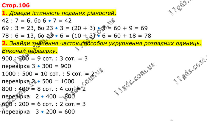 1. Доведи істинність поданих рівностей. 42 : 7 = 6, бо 6 • 7 = 42 69 : 3 = 23, бо 23 • 3 = (20 + 3) • 3 = 60 + 9 = 69 78 : 6 = 13, бо 13 • 6 = (10 + 3) • 6 = 60 + 18 = 78 2. Знайди значення часток способом укрупнення розрядних одиниць. Виконай перевірку. 900 : 300 = 9 сот. : 3 сот. = 3 перевірка 3 • 300 = 900 1000 : 500 = 10 сот. : 5 сот. = 2 перевірка 2 • 500 = 1000 800 : 400 = 8 сот. : 4 сот.= 2 перевірка 2 • 400 = 800 600 : 200 = 6 сот. : 2 сот.= 3 перевірка 3 • 200 = 600