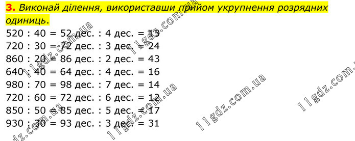 Виконай ділення, використавши прийом укрупнення розрядних одиниць. 520 : 40 = 52 дес. : 4 дес. = 13 720 : 30 = 72 дес. : 3 дес. = 24 860 : 20 = 86 дес. : 2 дес. = 43 640 : 40 = 64 дес. : 4 дес. = 16 980 : 70 = 98 дес. : 7 дес. = 14 720 : 60 = 72 дес. : 6 дес. = 12 850 : 50 = 85 дес. : 5 дес. = 17 930 : 30 = 93 дес. : 3 дес. = 31