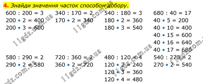 Знайди значення часток способом добору. 600 : 200 = 3 200 • 2 = 400 200 • 3 = 600 340 : 170 = 2 170 • 2 = 340 540 : 180 = 3 180 • 2 = 360 180 • 3 = 540 680 : 40 = 17 40 • 5 = 200 40 • 10 = 400 40 • 15 = 600 40 • 16 = 640 40 • 17 = 680 580 : 290 = 2 290 • 2 = 580 720 : 360 = 2 360 • 2 = 720 480 : 120 = 4 120 • 2 = 240 120 • 3 = 360 120 • 4 = 480 540 : 270 = 2 270 • 2 = 540