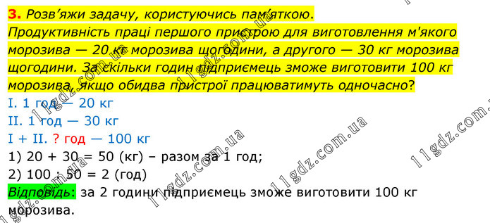 Розв’яжи задачу, користуючись пам’яткою. Про¬дуктивність праці першого пристрою для виготовлення м'якого морозива — 20 кг морозива щогодини, а другого — 30 кг морозива щогодини. За скільки годин підприємець зможе виготовити 100 кг морозива, якщо обидва пристрої працюватимуть одночасно? І. 1 год — 20 кг ІІ. 1 год — 30 кг І + ІІ. ? год — 100 кг 1) 20 + 30 = 50 (кг) – разом за 1 год; 2) 100 : 50 = 2 (год) Відповідь: за 2 години підприємець зможе виготовити 100 кг морозива.