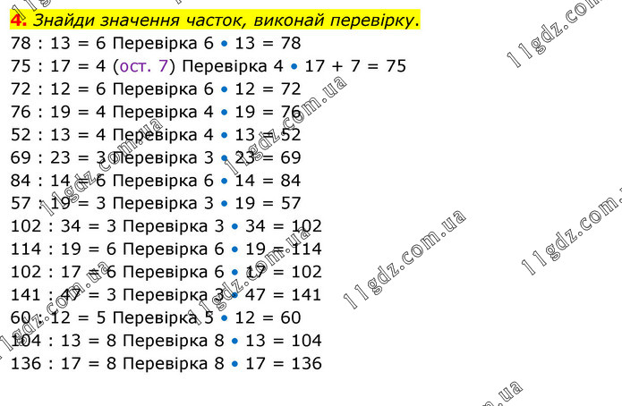Знайди значення часток, виконай перевірку. 78 : 13 = 6 Перевірка 6 • 13 = 78 75 : 17 = 4 (ост. 7) Перевірка 4 • 17 + 7 = 75 72 : 12 = 6 Перевірка 6 • 12 = 72 76 : 19 = 4 Перевірка 4 • 19 = 76 52 : 13 = 4 Перевірка 4 • 13 = 52 69 : 23 = 3 Перевірка 3 • 23 = 69 84 : 14 = 6 Перевірка 6 • 14 = 84 57 : 19 = 3 Перевірка 3 • 19 = 57 102 : 34 = 3 Перевірка 3 • 34 = 102 114 : 19 = 6 Перевірка 6 • 19 = 114 102 : 17 = 6 Перевірка 6 • 17 = 102 141 : 47 = 3 Перевірка 3 • 47 = 141 60 : 12 = 5 Перевірка 5 • 12 = 60 104 : 13 = 8 Перевірка 8 • 13 = 104 136 : 17 = 8 Перевірка 8 • 17 = 136