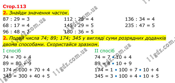 2. Знайди значення часток. 87 : 29 = 3 68 : 17 = 4 96 : 48 = 2 112 : 28 = 4 145 : 29 = 5 180 : 36 = 5 136 : 34 = 4 235 : 47 = 5 2. Подай числа 74; 89; 174; 345 у вигляді суми розрядних доданків двома способами. Скористайся зразком. І спосіб 74 = 70 + 4 89 = 80 + 9 174 = 100 + 70 + 4 345 = 300 + 40 + 5 ІІ спосіб 74 = 7 • 10 + 4 89 = 8 • 10 + 9 174 = 1 • 100 + 7 • 10 + 4 345 = 3 • 100 + 4 • 10 + 5