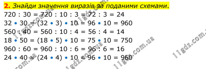 Знайди значення виразів за поданими схемами. 720 : 30 = 720 : 10 : 3 = 72 : 3 = 24 32 • 30 = (32 • 3) • 10 = 96 • 10 = 960 560 : 40 = 560 : 10 : 4 = 56 : 4 = 14 18 • 50 = (18 • 5) • 10 = 75 • 10 = 750 960 : 60 = 960 : 10 : 6 = 96 : 6 = 16 24 • 40 = (24 • 4) • 10 = 96 • 10 = 960