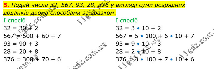 Подай числа 32, 567, 93, 28, 376 у вигляді суми розрядних доданків двома способами за зразком. І спосіб 32 = 30 + 2 567 = 500 + 60 + 7 93 = 90 + 3 28 = 20 + 8 376 = 300 + 70 + 6 І спосіб 32 = 3 • 10 + 2 567 = 5 • 100 + 6 • 10 + 7 93 = 9 • 10 + 3 28 = 2 • 10 + 8 376 = 3 • 100 + 7 • 10 + 6